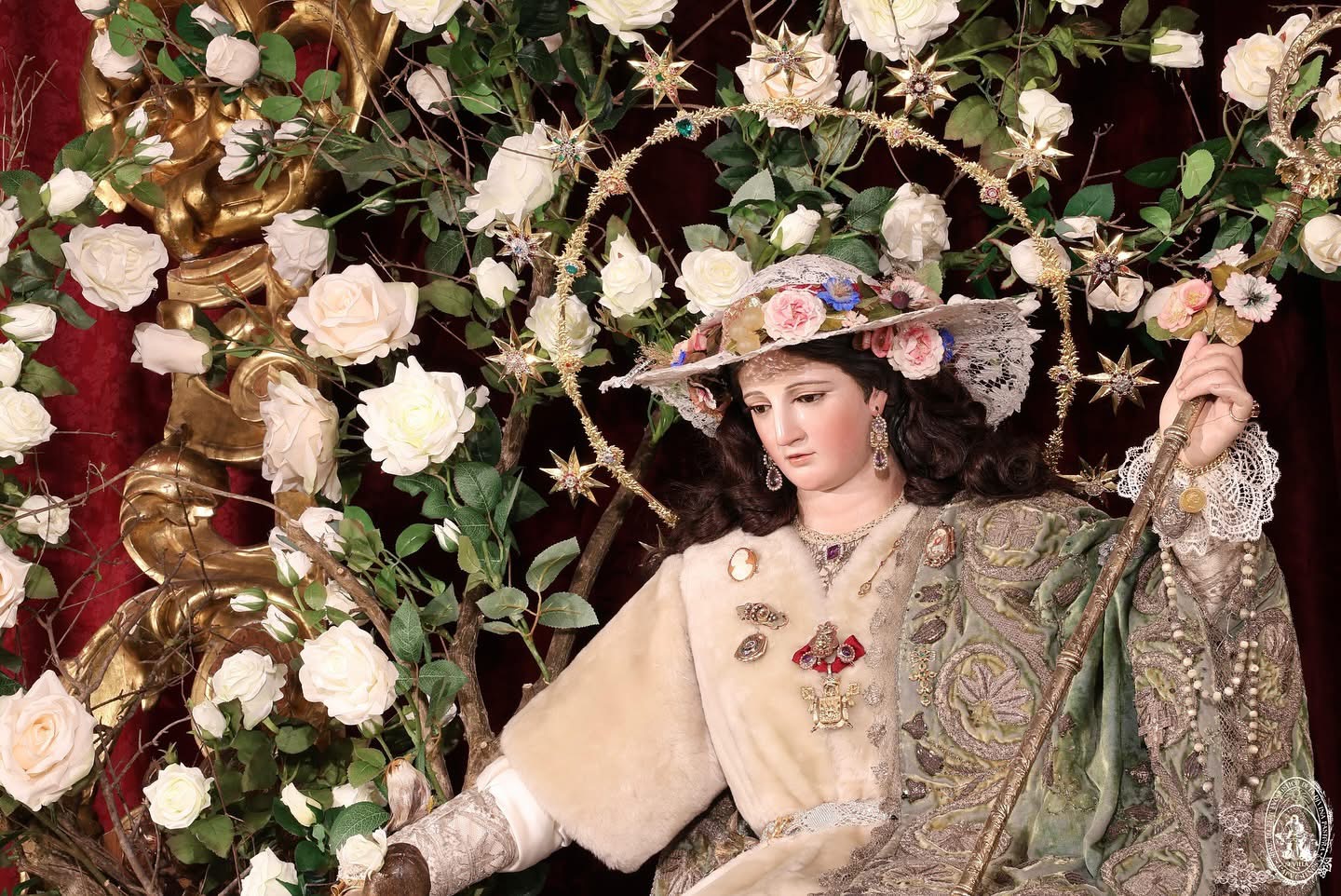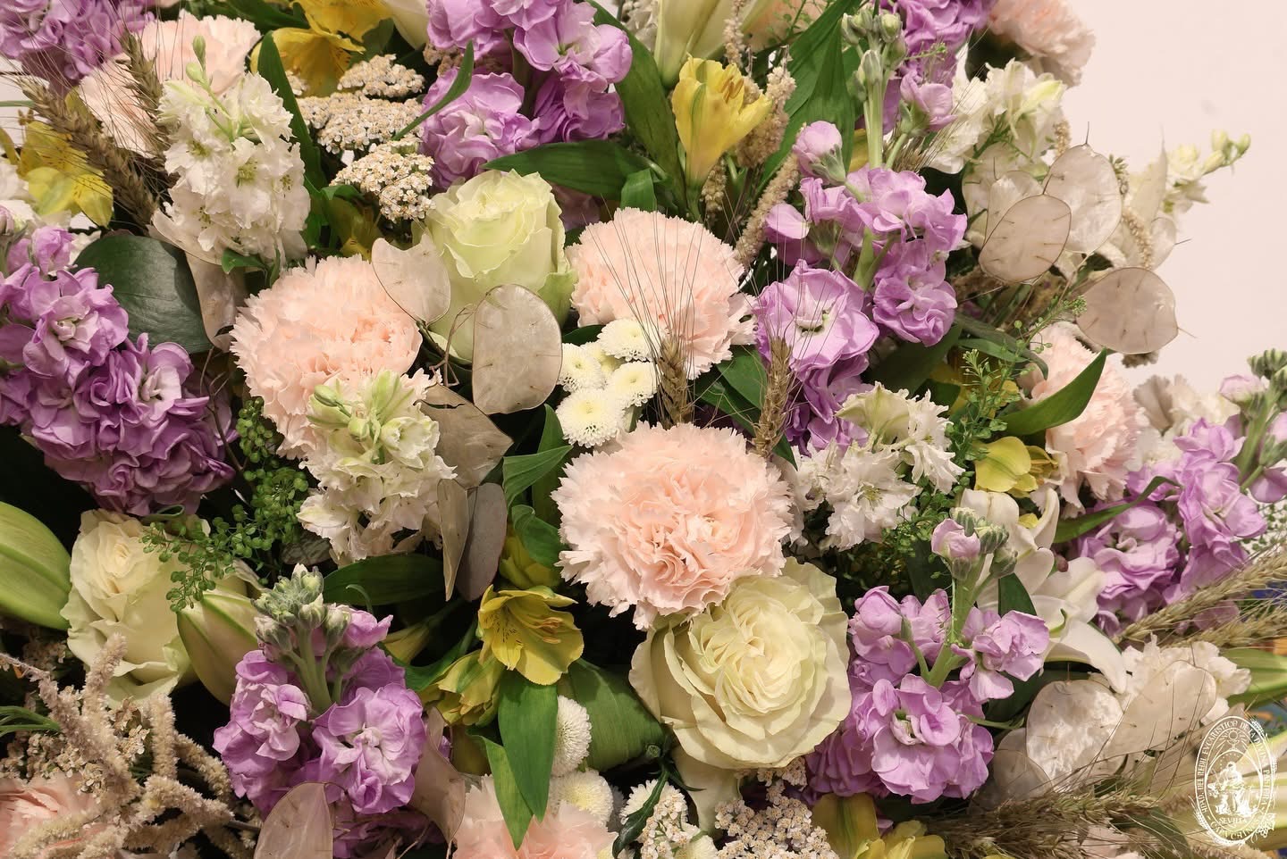El exorno floral está compuesto por alelies, rosas, santini y astromelias realizado por Miguel Murillo.